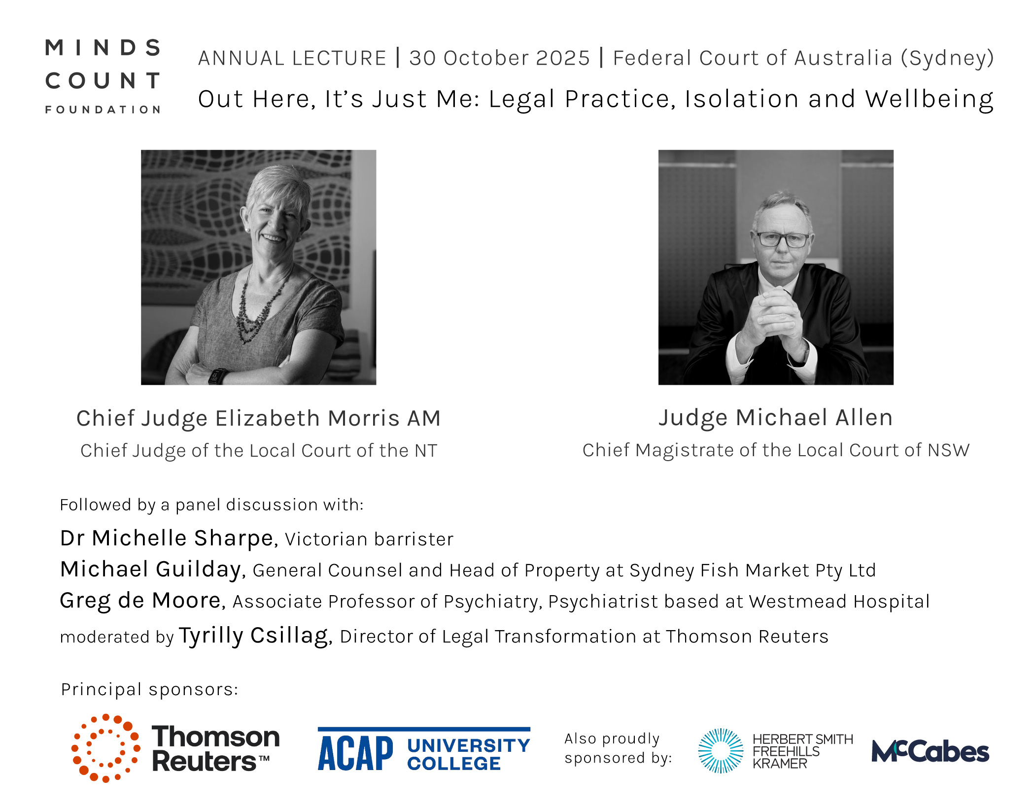 Join us for the 2025 Minds Count Annual Lecture, an evening bringing together legal leaders and wellbeing experts to share insights and practical perspectives.